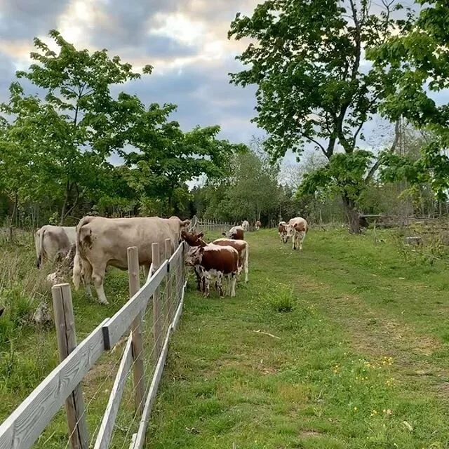 Vi ønsker å ha en livskraftig økologisk stamme på 40 telemarkskyr som utnytter gårdens egne ressurser gjennom året. Vi er så heldige at vi har et fantastisk kulturlandskap som dyrene kan boltre seg på. På vinterstid kan kyrene gå rett ut av fjøset og inn på beitene om de ønsker det. For å sikre en livskraftig besetning vil noen av disse kalvene bli nye kyr hos oss, og noen vil bli solgt som slakt.